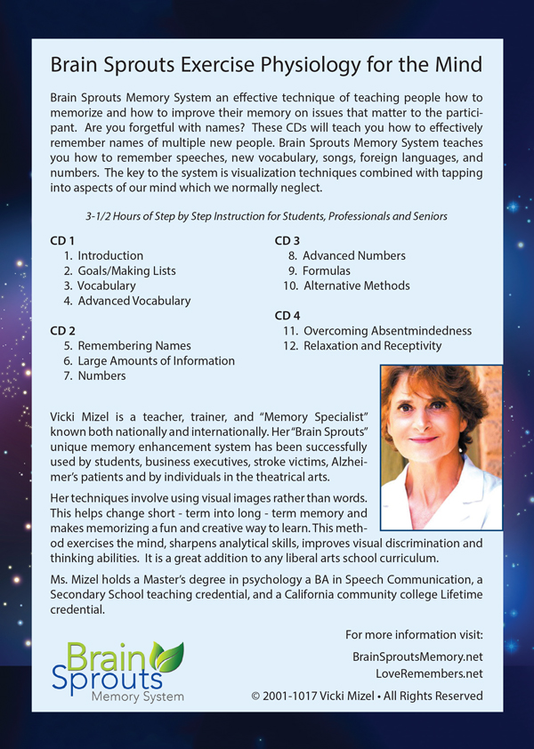 Brain Sprouts Memory System an effective technique of teaching people how to memorize and how to improve their memory on issues that matter to the partici-pant. Are you forgetful with names? These CDs will teach you how to effectively remember names of multiple new people. Brain Sprouts Memory System teaches you how to remember speeches, new vocabulary, songs, foreign languages, and numbers. The key to the system is visualization techniques combined with tapping into aspects of our mind which we normally neglect.